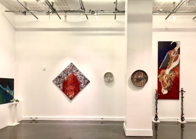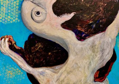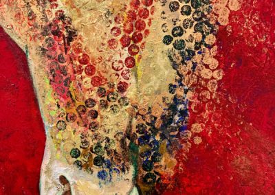 Mais les œuvres croisées et enrichies de leur stock d’imaginaire érotique, si le sexe est souvent présent, diffus, ouvert ou érigé, enchevêtré, pénétrant, il l’est certes sans pudeur mais sans provocation non plus. C’est une fête des sens, une cosmologie orgasmique et ludique, teintée d’humour à laquelle nous sommes conviés, et nous sentons bien que le jeu et le plaisir des artistes l’emportent sur le désir de suggérer la jouissance ou d’inviter au voyeurisme. C’est un univers marin qui nous est proposé où les algues et les coques flirtent avec les tubes de peinture étalés en pâtes lourdes dont les effets de marbrure évoquent ces glaçages qui servaient aux pages de garde des anciens livres reliés.